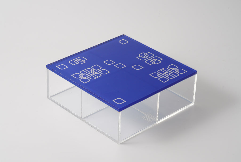 Beautiful rectangle black transparent acrylic box with 2D white flowers lid featuring an intricate pattern inspired by traditional Arabic floral motifs. The white designs resemble stylized flowers, with interlocking petals and geometric symmetry, creating a delicate yet modern aesthetic. These floral patterns add a touch of cultural elegance to the box, blending tradition with contemporary design. The transparent sides of the box enhance its simplicity, allowing the ornate blue top to stand out beautifully.